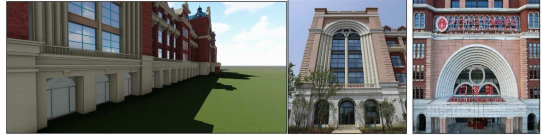 外立面采用正統(tǒng)的英式古典復(fù)興風(fēng)格,造型復(fù)雜,由石材、軟瓷、仿石鋁板、 GRC構(gòu)件、西式陶瓦等多種材料拼接和結(jié)合,多種材料交替使用,界面清晰,線條順直, 曲線圓滑;西式陶瓦、坡屋面、幕墻等建筑手法的巧妙運(yùn)用,賦予建筑獨(dú)特的韻律和美感。