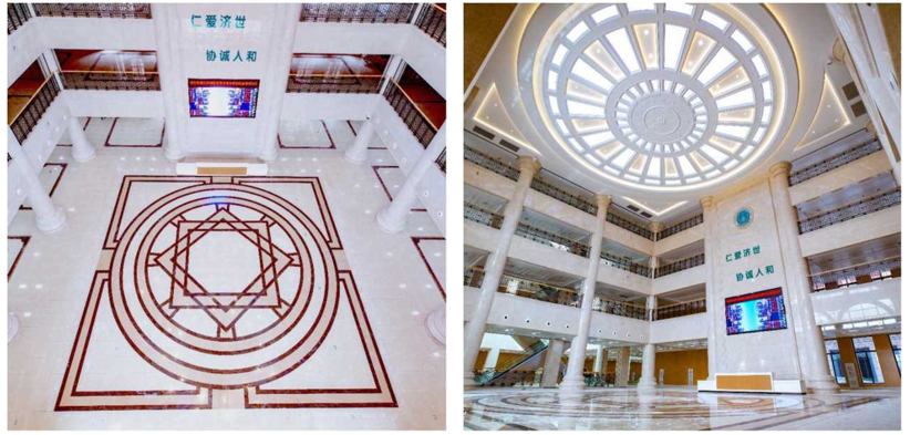 門診大廳采用多層圓形GRG吊頂,質(zhì)量輕、不變形、安全性好、防潮、防火、阻燃性能好,屬綠色環(huán)保材料類,造型豐富,聲學(xué)效果好,加工周期短,施工便捷、品質(zhì)穩(wěn)定,裝飾效 果凸顯大氣,整體風(fēng)格協(xié)調(diào),與地面拼花上下對(duì)中,天地相應(yīng)。