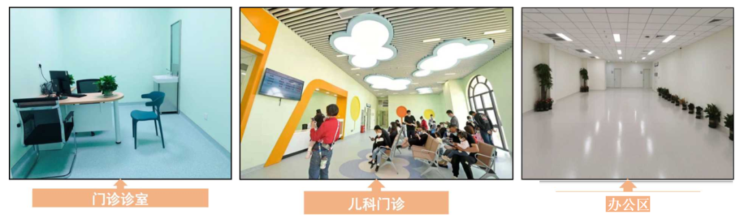 兒科區(qū)域天空、地面云朵、墻面城堡卡通造型設(shè)計(jì),烤漆板,鋁方通、地膠、玻纖壁布搭配,效果溫馨,不同材料色彩運(yùn)用,盡顯人性化設(shè)計(jì)。診室、辦公區(qū)墻地面裝飾簡(jiǎn)潔明亮,干凈舒宜,地面PVC地膠,墻面玻纖壁布,耐磨耐用,抗污效果好,容易清潔,質(zhì)感柔和,色彩豐富,選擇面廣。